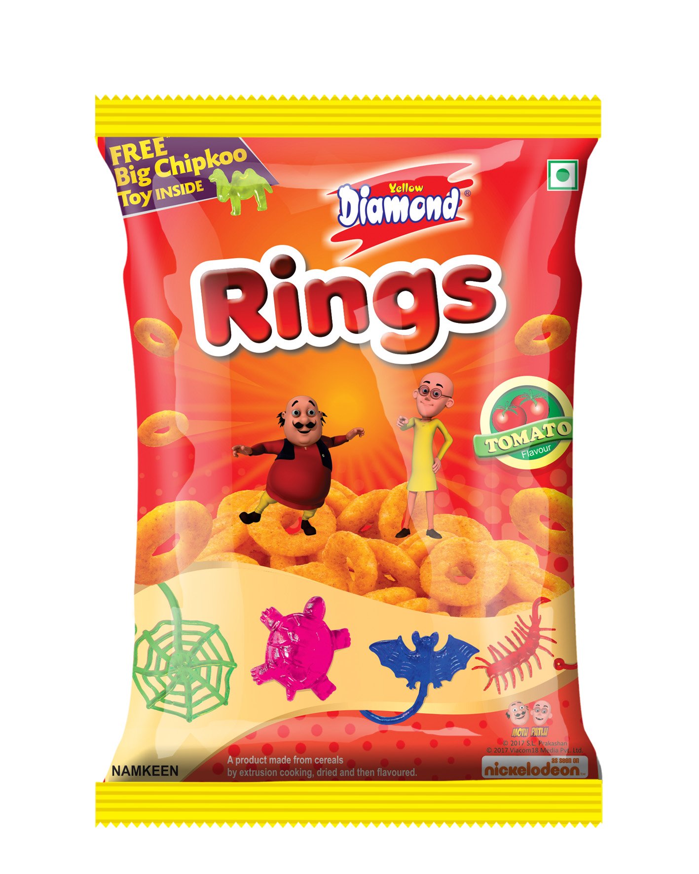 YELLOW DIAMOND RINGS IS A LIP SMACKING SNACK MADE FROM CEREALS BY EXTRUSION COOKING FIRST, WHICH IS LATER DRIED AND FLAVOURED
